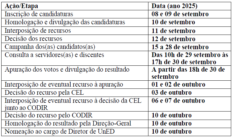 A votação para a escolha do(a) novo(a) Diretor(a) da Uned se dará através de processo de votação secreta utilizando-se urnas e cédulas eletrônicas (https://eleicoes.cefet-rj.br), conforme Art. 19 das Normas do Processo Eleitoral (Resolução nº 24/CODIR, de 23/05/2025), no período de 10h de 29 de setembro até 17h de 30 de setembro de 2025. Todas as etapas do processo eleitoral se darão conforme calendário abaixo: