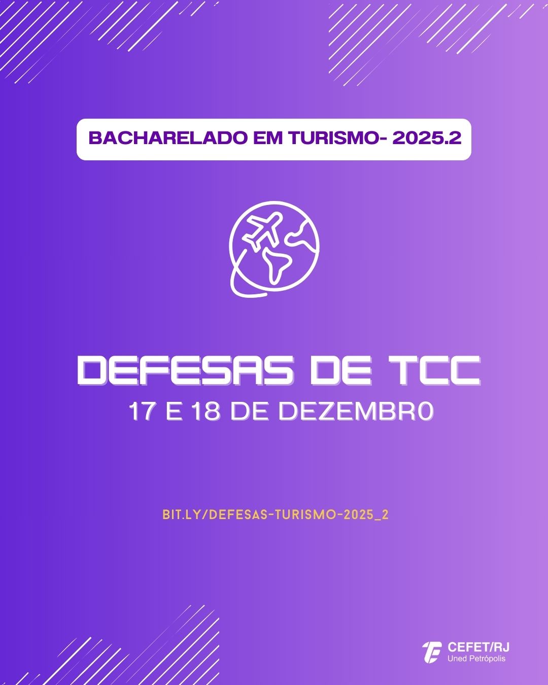 A coordenação do curso de Bacharelado em Turismo do Cefet/RJ Petrópolis divulgou o calendário de defesas dos Trabalhos de Conclusão de Curso (TCC), referentes ao 2º semestre de...