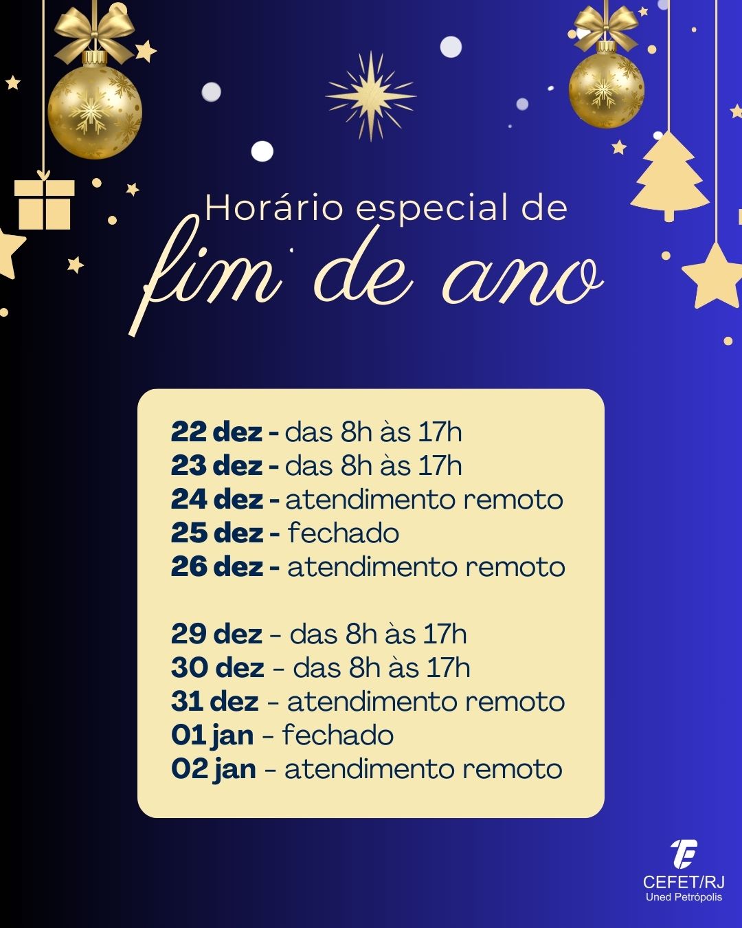 O Cefet/Petrópolis terá um horário de funcionamento especial neste fim de ano. Confira os horários da unidade, da Seção de Registros Acadêmicos (Serac) e da Biblioteca...
