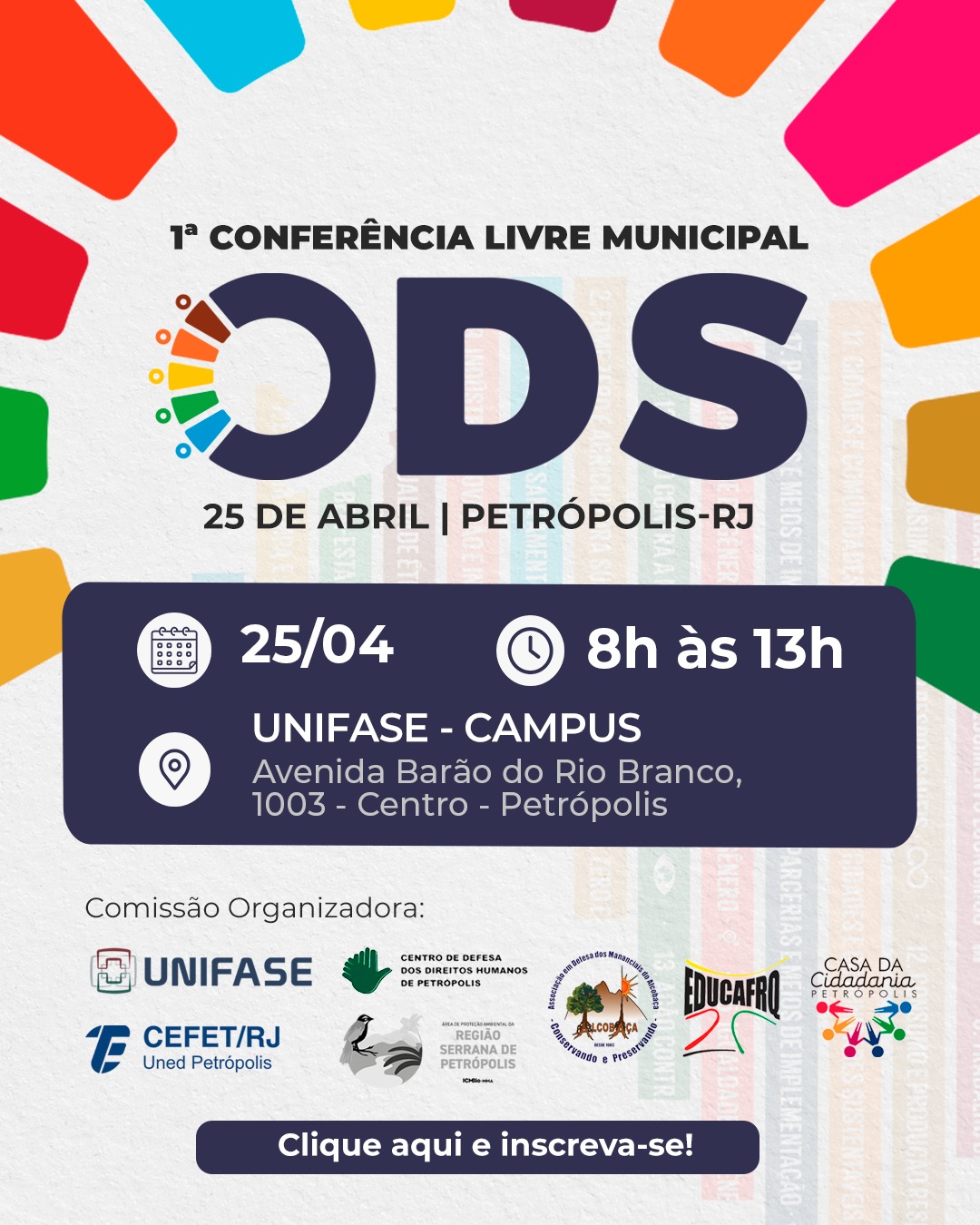No dia 25 de abril, das 8h às 13h, o Cefet/RJ Petrópolis participará da 1ª Conferência Livre Municipal dos Objetivos de Desenvolvimento Sustentável (ODS), promovida pela UNIFASE, em...