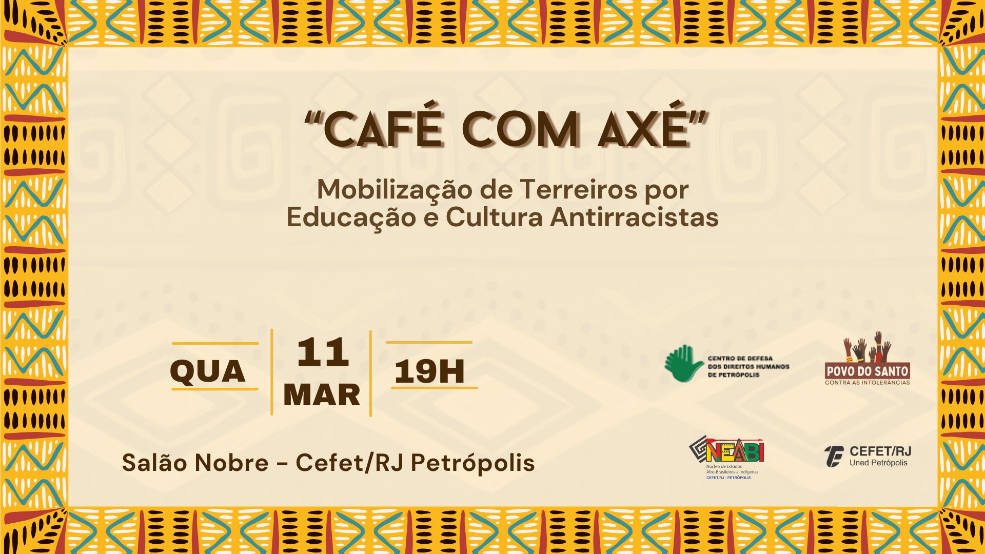 O Núcleo de Estudos Afro-brasileiros e Indígenas (Neabi) do Cefet/RJ Petrópolis, em parceria com o Coletivo Povo Santo, promove na próxima quarta-feira, dia 11 de março, o “Café com Axé – Mobilização de Terreiros por Educação e Cultura Antirracistas”. A atividade será realizada às 19h, no Salão Nobre da instituição, com entrada gratuita e aberta ao público.