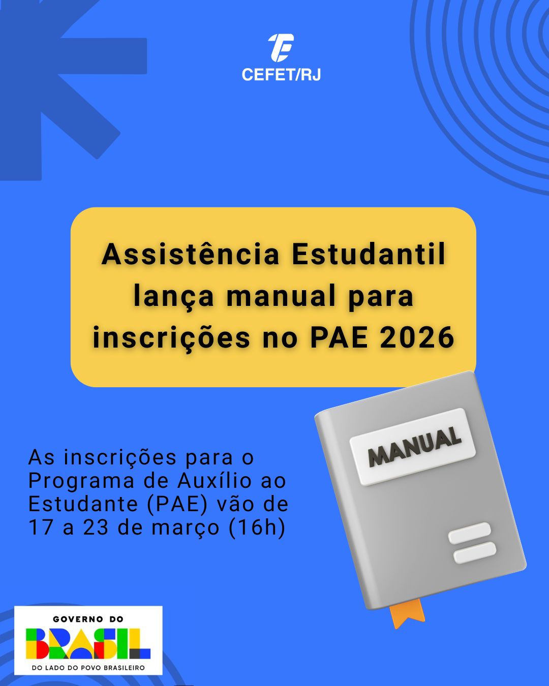 A Assistência Estudantil do Cefet/RJ elaborou o “Manual de Inscrições PAE – Edital 005/2026” para auxiliar os alunos no procedimento de inscrição no Programa de Auxílio ao...