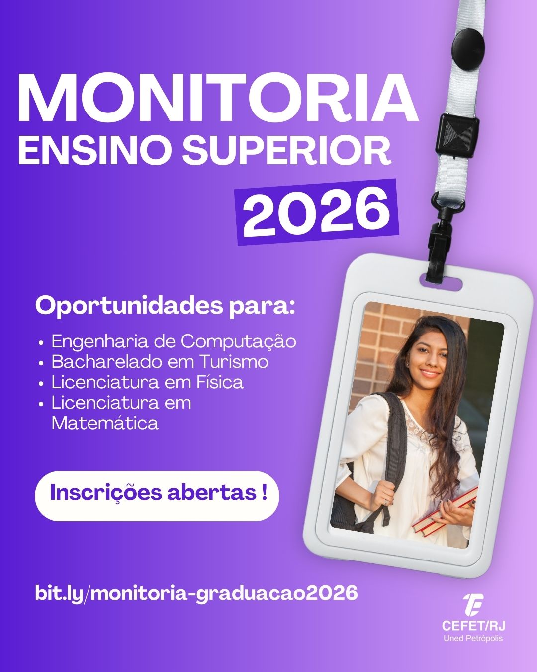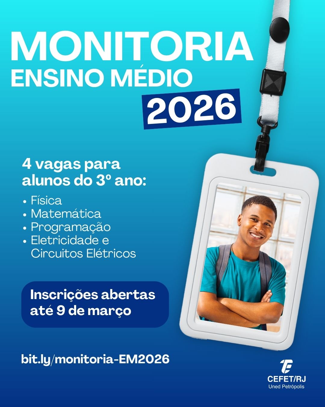 Estão abertas as inscrições para o Programa de Monitoria 2026 do curso técnico em Telecomunicações integrado ao ensino médio do Cefet/RJ Petrópolis. O processo seletivo oferece...