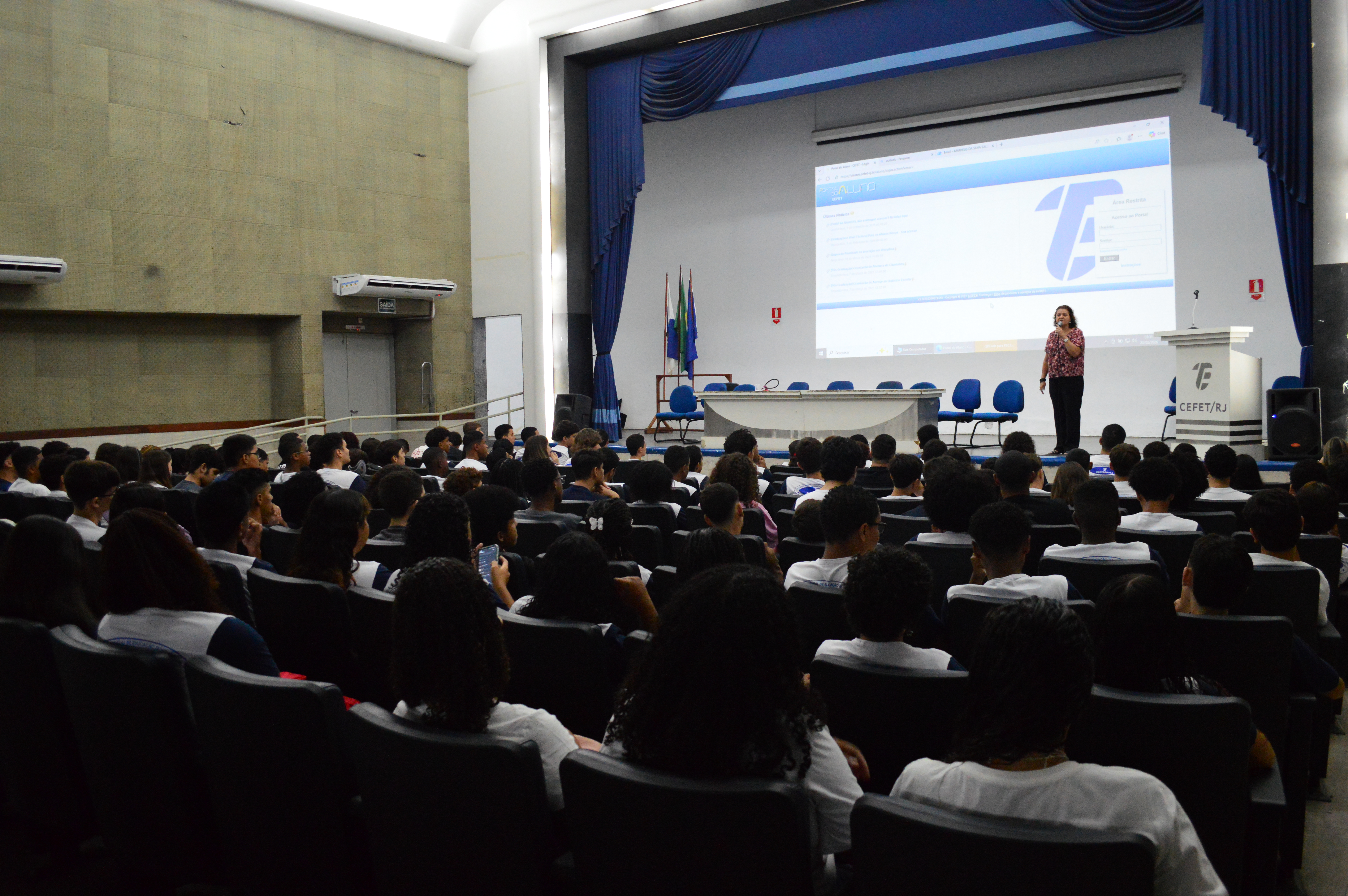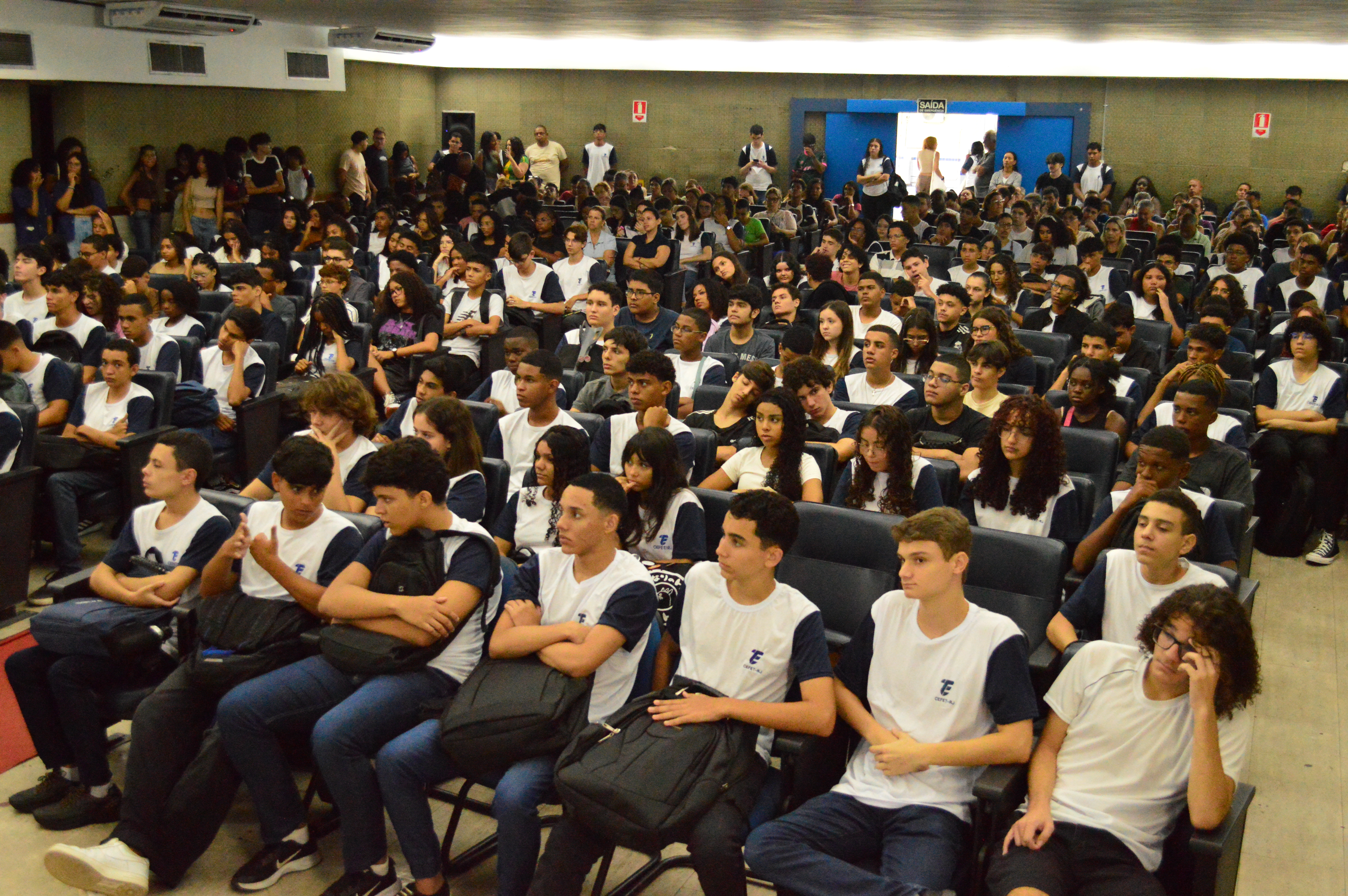 Auditório 1 lotado com calouros do ensino médio/técnico vindos de diversos bairros do Rio de Janeiro e cidades do entorno