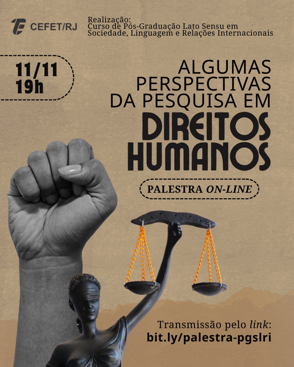 No dia 11 de outubro, às 19h, o curso de Pós-Graduação Lato Sensu em Sociedade, Linguagem e Relações Internacionais promoverá à palestra on-line “Algumas perspectivas da pesquisa em Direitos Humanos”. A palestra será ministrada pelo professor Danilo Junior de Oliveira, como conclusão do ciclo de disciplinas da turma iniciada em 2024. A atividade é aberta ao público, em especial pesquisadores e demais interessados em ciências humanas e sociais, e as inscrições devem ser feitas até o dia 9 de outubro pelo formulário de inscrição.