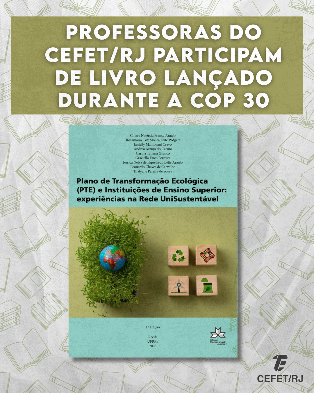 O texto “Frutos da gestão sustentável do Cefet/RJ em tempos de transição ecológica e social”, de autoria das professoras Aline Guimarães Monteiro Trigo e Úrsula Maruyama, foi publicado como um dos capítulos do e-book “Plano de Transformação Ecológica (PTE) e Instituições de Ensino Superior: experiências na Rede UniSustentável”. O livro foi lançado durante a 30ª Conferência das Nações Unidas sobre Mudança Climática (COP 30), realizada no mês de novembro em Belém, no Pará.