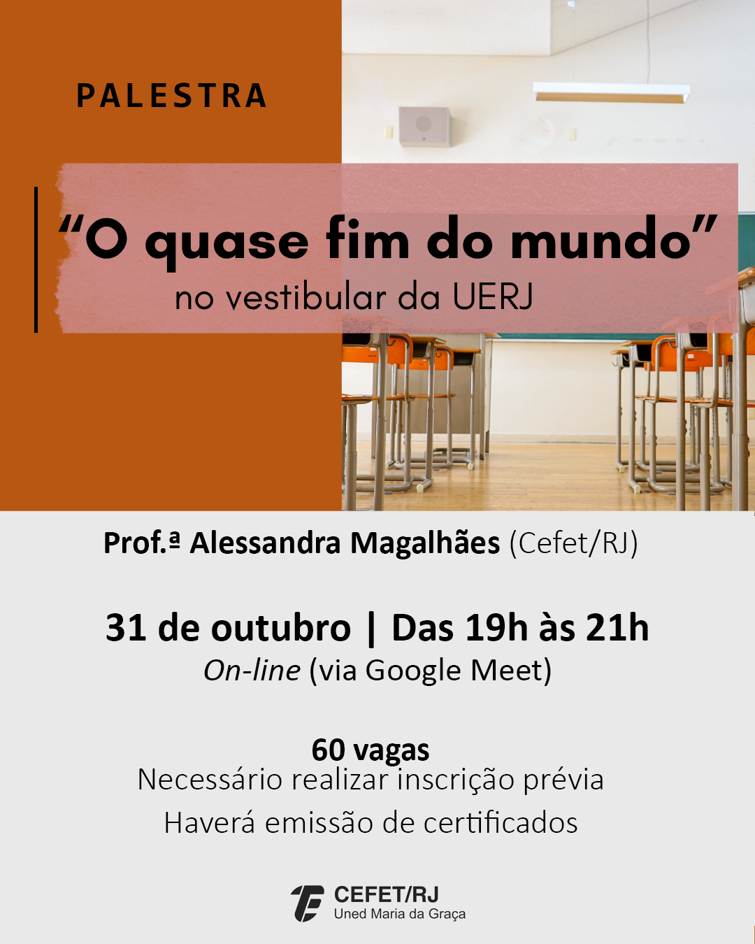 A palestra será ministrada pela professora Alessandra Magalhães, do Cefet/RJ Uned Maria da Graça. Serão oferecidas 60 vagas e, para participar, é necessário realizar inscrição prévia. Haverá emissão de certificados para os participantes.
