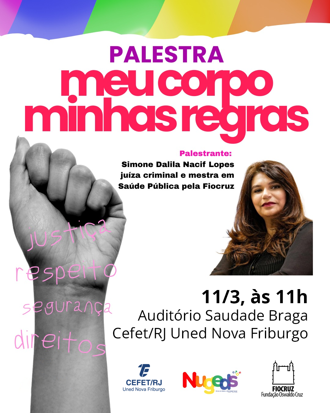 A palestra, intitulada “Meu corpo, minhas regras”, será proferida pela juíza criminal e mestra em saúde pública pela Fundação Oswaldo Cruz (Fiocruz), Simone Dalila Nacif Lopes, da 1ª Vara Criminal da Comarca de Nova Friburgo. O encontro aborda questões que perpassam corpos femininos e as violências de gênero que os atravessam. O evento será realizado no Auditório Saudade Braga, na Uned Friburgo, e é aberto ao público interno e externo.