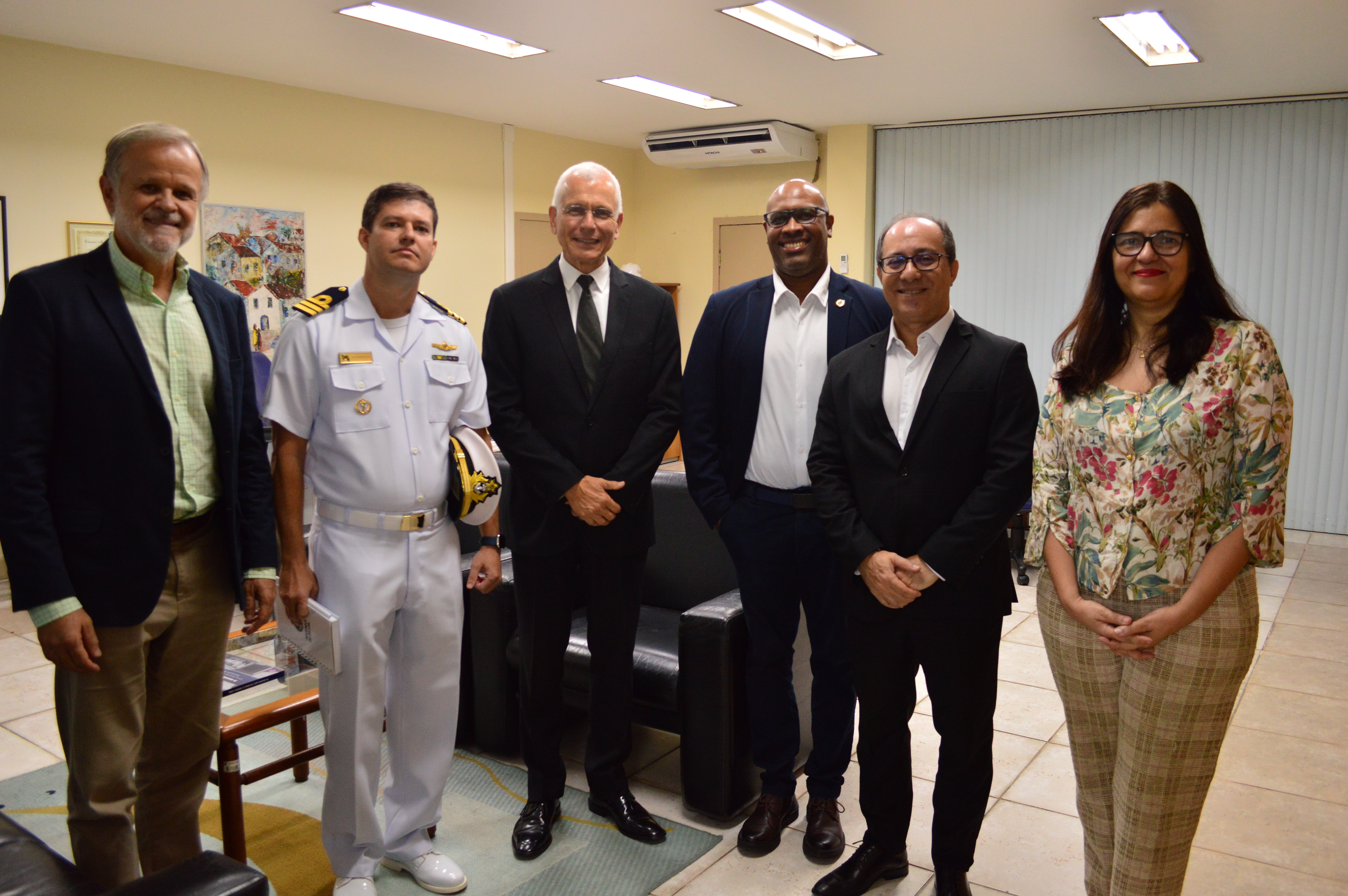Da esq. para dir. Rodolfo Wadovski (capitão de fragata da Marinha), Alessandro Pereira (capitão de fragata da Marinha), Marcio Rocha (contra-almirante da Marinha e diretor do INPG), Ronney Boloy (diretor da Diretoria de Pesquisa e Pós-Graduação do Cefet/RJ), Mauricio Motta (diretor-geral), Gisele Vieira (vice-diretora)