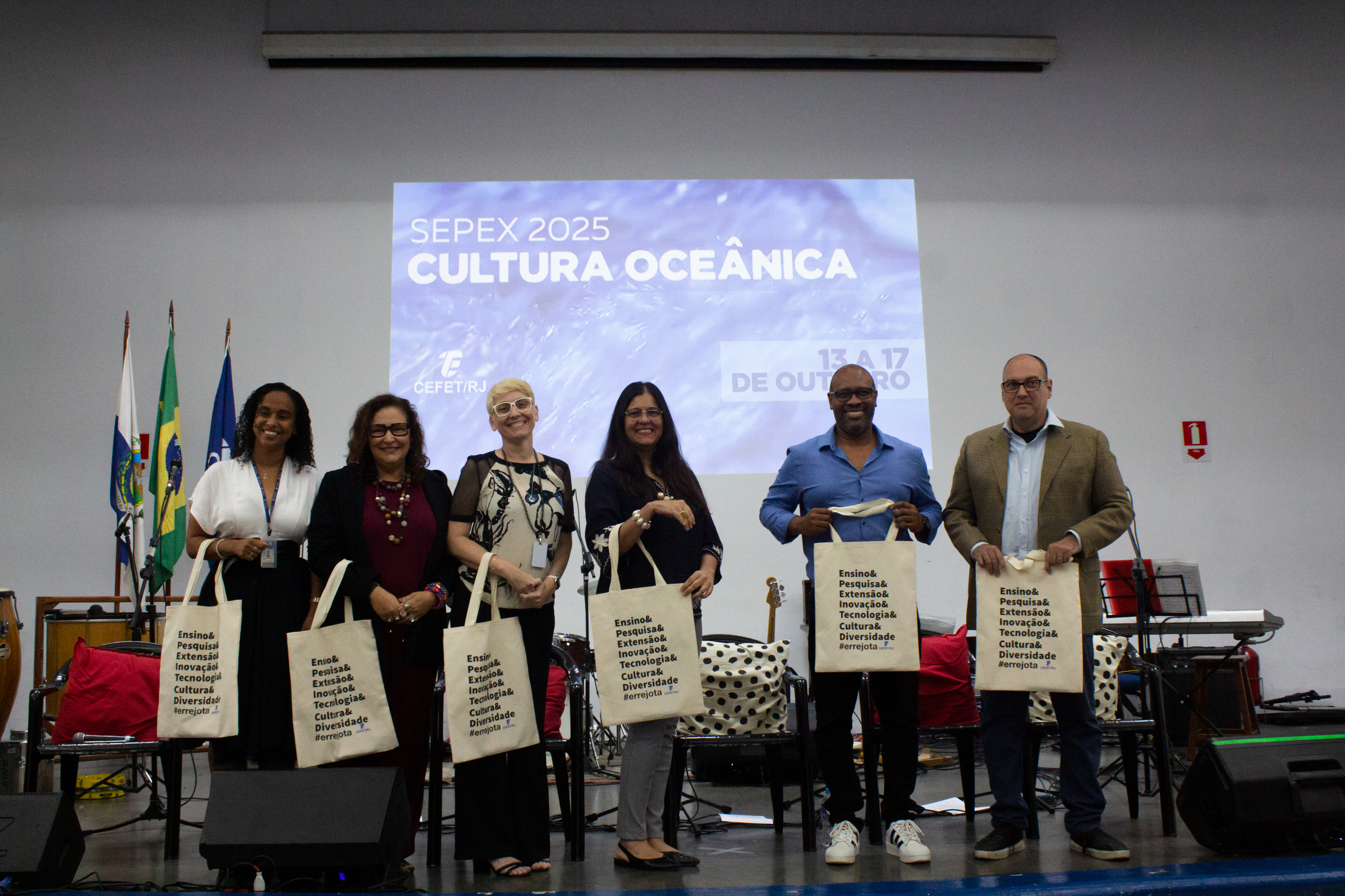 A Semana de Ensino, Pesquisa e Extensão (Sepex) 2025 do Cefet/RJ foi oficialmente aberta nesta quarta-feira (15), em cerimônia realizada no Auditório 1 da Unidade Maracanã. A mesa de abertura contou com a presença da vice-diretora-geral, Gisele Vieira, da diretora de Ensino, Dayse Pastore, do diretor de Pesquisa e Pós-Graduação, Ronney Boloy, da diretora de Extensão, Renata Moura, do diretor de Gestão Estratégica, Diego Carvalho, e da chefe do Departamento de Extensão e Assuntos Comunitários (DEAC), Luciana Espíndola. O evento tem como tema “Cultura Oceânica” e acontece em todas as unidades da instituição de 13 a 17 de outubro.