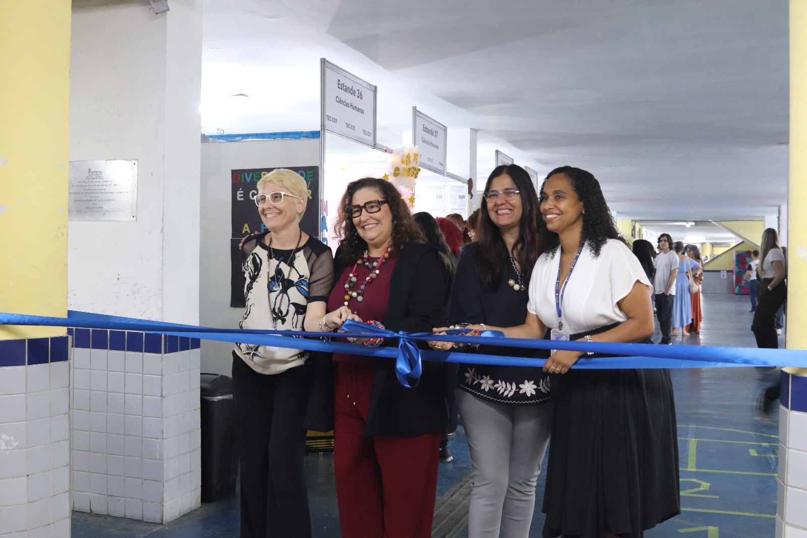 As diretoras de Ensino, Dayse Pastore, e de Extensão, Renata Moura, a vice-diretora-geral, Gisele Vieira, e a chefe do DEAC, Luciana Espíndola, cortaram a fita, gesto que simboliza a abertura oficial da Expotec (exposição de projetos/protótipos desenvolvidos pelos alunos do ensino médio/técnico) e da Exposup (exposição de projetos/protótipos desenvolvidos pelos alunos do ensino superior)