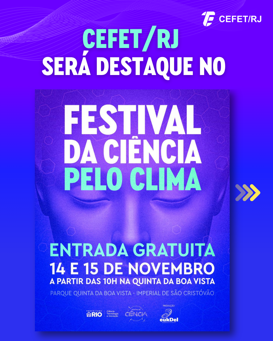 O Cefet/RJ é uma das 21 instituições de ensino e pesquisa participantes do Festival da Ciência pelo Clima, que será realizado nos dias 14 e 15 de novembro, das 10h às 18h, na Quinta da Boa Vista, no Rio de Janeiro, com entrada gratuita. A terceira edição do festival terá como foco o meio ambiente, a sustentabilidade e as mudanças climáticas. O evento é promovido pela Secretaria Municipal de Ciência, Tecnologia e Inovação da Prefeitura do Rio de Janeiro. Clique aqui para ver a programação completa.