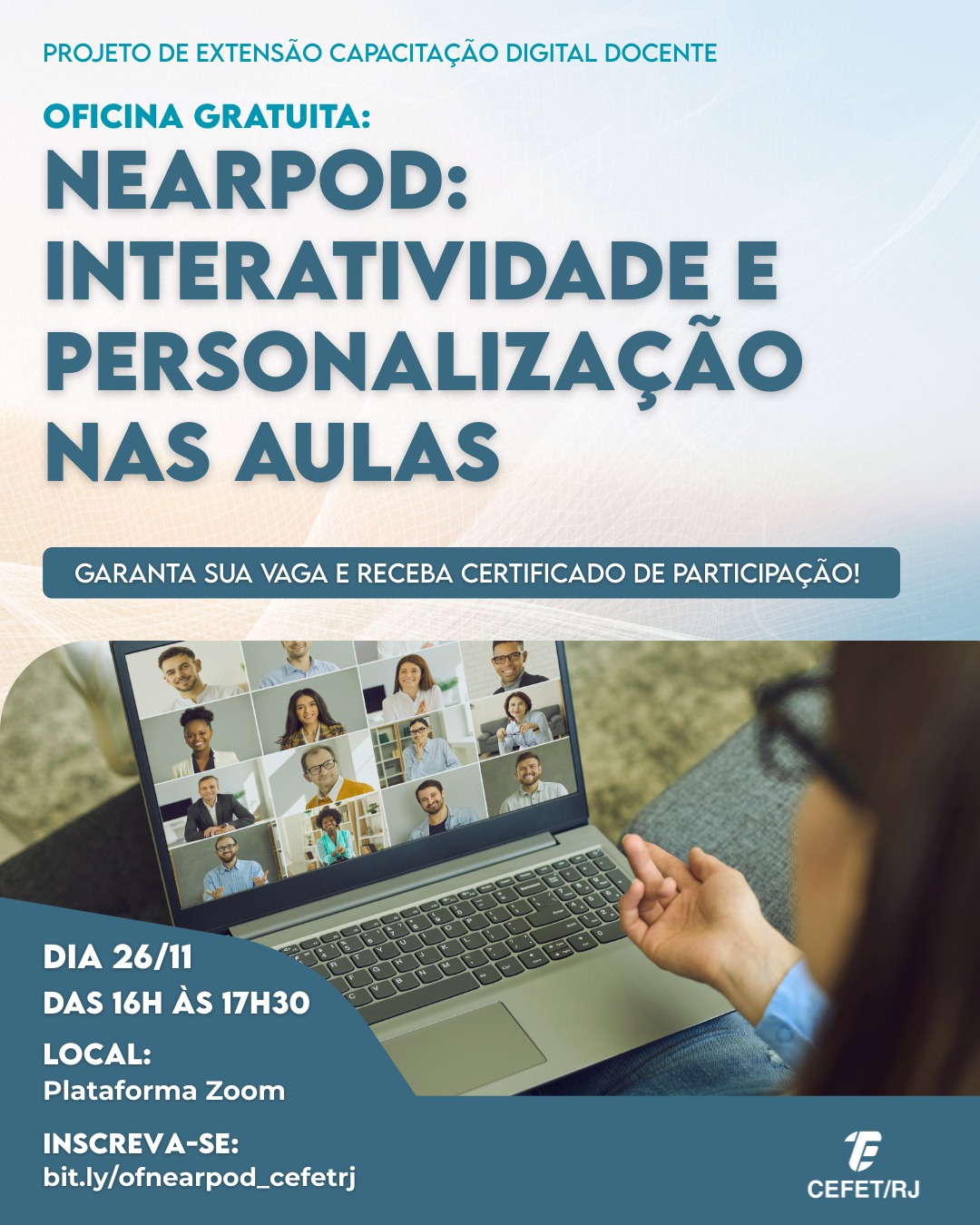 O projeto de extensão Competência Digital Docente, da Unidade Maracanã, promoverá, no dia 26 de novembro, a oficina “Nearpod: interatividade e personalização nas aulas”. A capacitação é gratuita e aberta a docentes do Cefet/RJ e de outras instituições. A atividade será on-line, via Zoom, das 16h às 17h30, e contará com certificado de participação. Clique aqui para se inscrever. O link do curso será enviado por e-mail aos participantes.